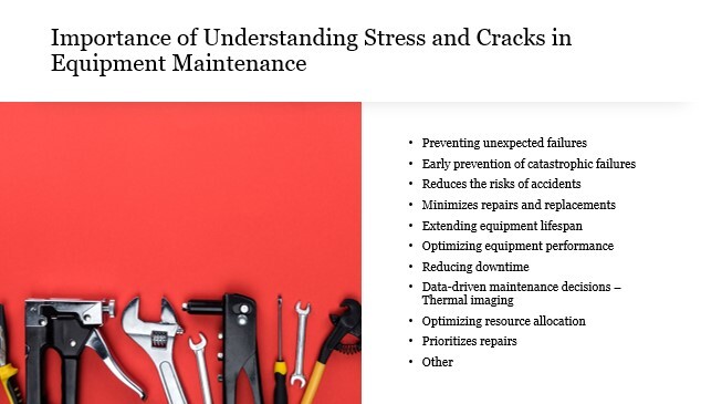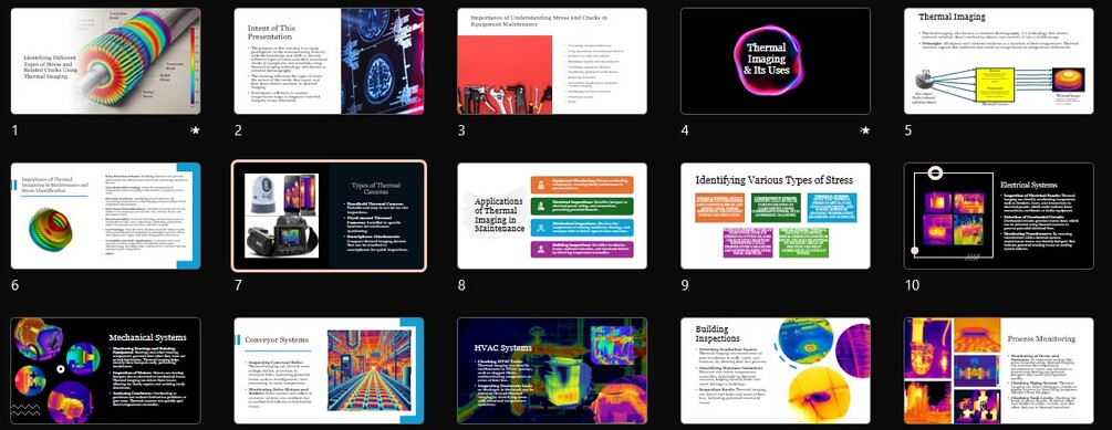 This comprehensive training deck equips manufacturing professionals with the knowledge to identify stress types and related cracks in materials using thermal imaging (infrared thermography). It covers key concepts, practical examples, and advanced analysis techniques to enhance operational efficiency and reduce downtime.